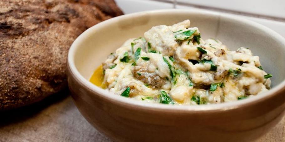 Bland med hakket hvidløg, olivenolie, creme fraiche og citronsaft.