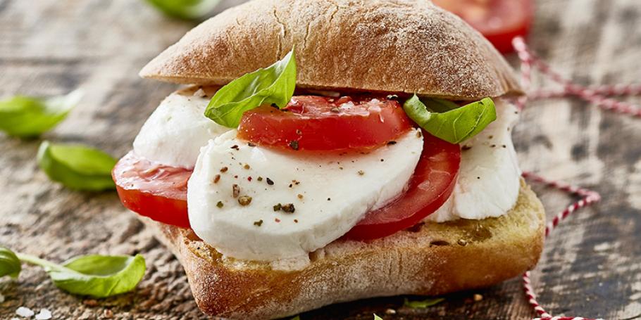 HjemOpskrifterCiabatta sandwich med mozzarella, tomat og basilikum