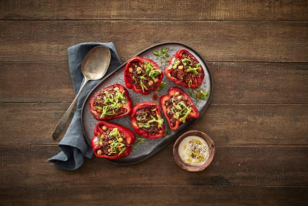Grillede fyldte peberfrugter med kikærter, quinoa og sesamdressing