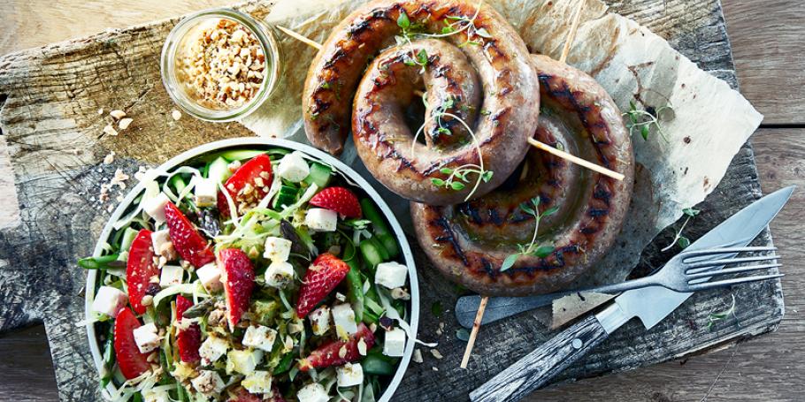 Server til grillet medister. Tip: Læg træspyd i blød i 10 min. så brænder de ikke under grilning.