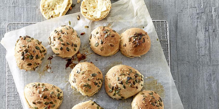 Form ca. 12 store boller med fugtige fingre, vend dem i græskarkerner og sæt dem på en bageplade med bagepapir.