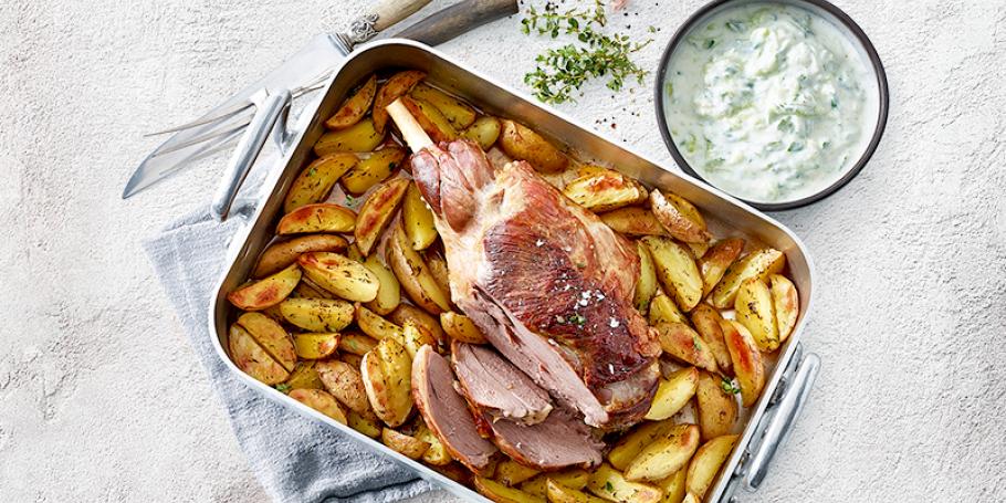 Helstegt lammekølle med ovnbagte kartofler og tzatiki