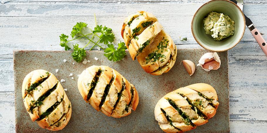 Bland blødt smør med knust hvidløg og krydderurter og fordel smørret mellem skiverne, inden du lægger brødet på grillen. Husk at lave rigeligt – det smager af mere!.