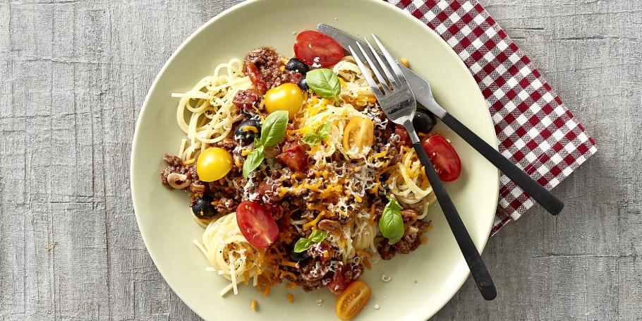 Vend den afdryppede spaghetti i kødsaucen og server staks med revet parmesanost blandet med revet cheddar.