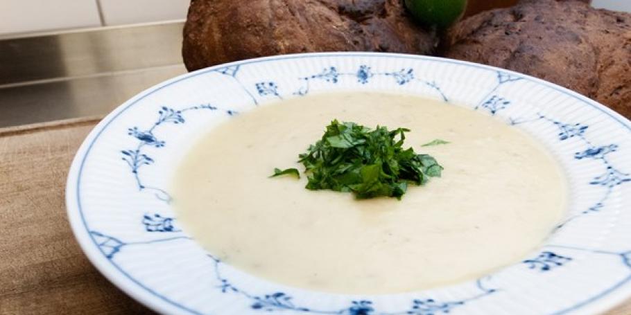 Server med purløg, sprød bacon eller croutoner samt et godt brød.
