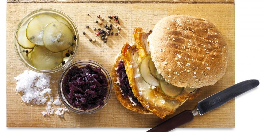 Saml derefter burgeren med rødkål, ribbenssteg, salt og de syltede agurker i bollen.