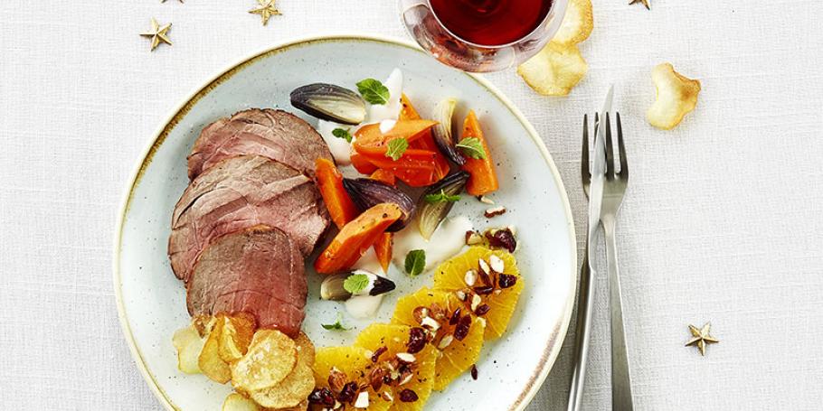 Stegen skæres i tynde skiver og anrettes med de honningbagte løg og gulerødder, appelsincarpaccio og kartoffelchips.