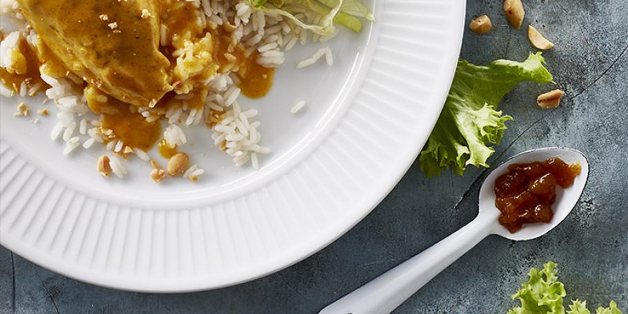 Servér med kogte ris, grøn salat, mangochutney og grofthakkede peanuts.