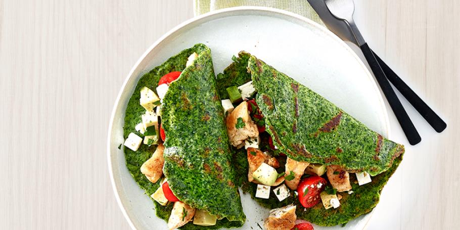 Fordel kyllingen, avocado, salatost, persille, lidt citronsaft, let ristede sesamfrø og de friske cherrytomater på hver pandekage.