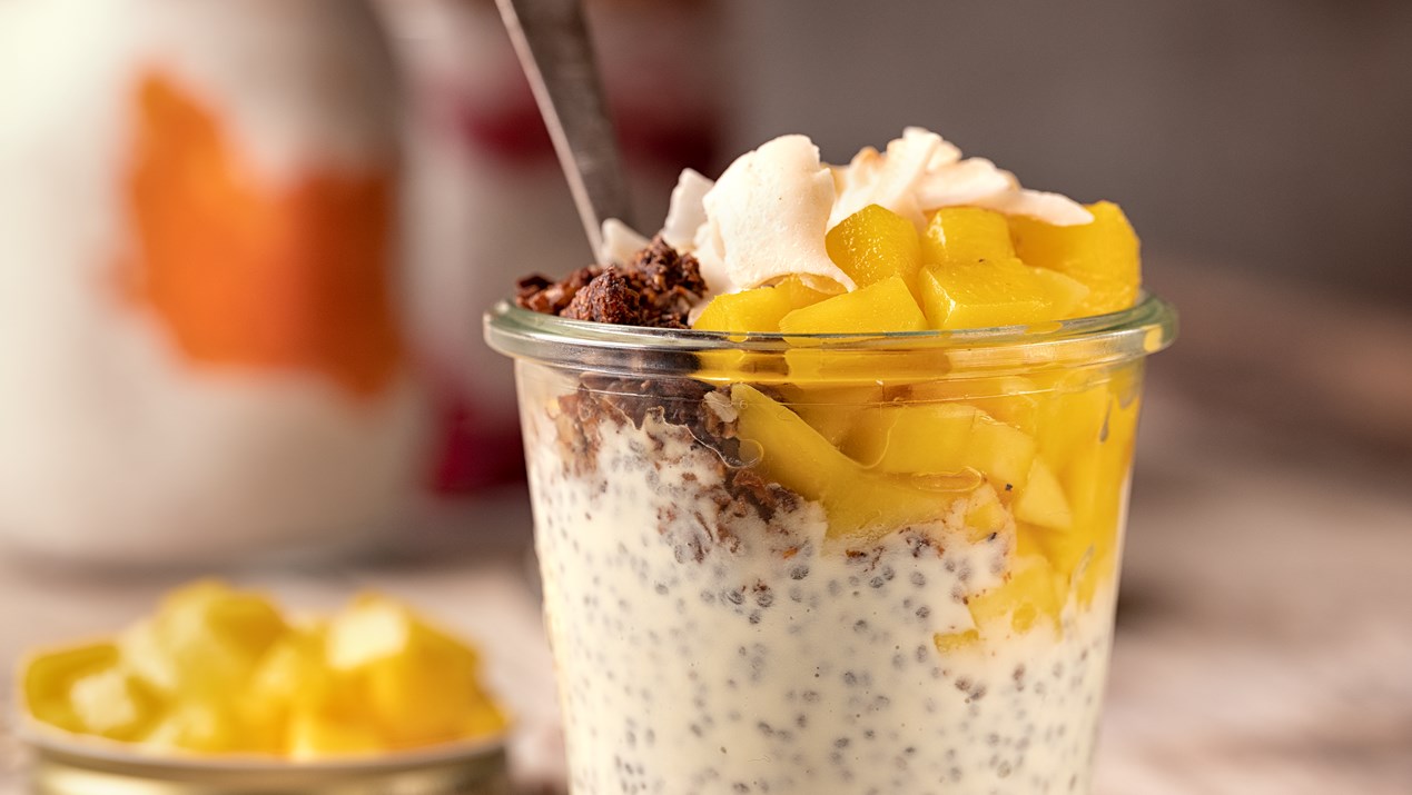 Rør frugtyoghurt/skyr og chiafrø sammen i et glas.