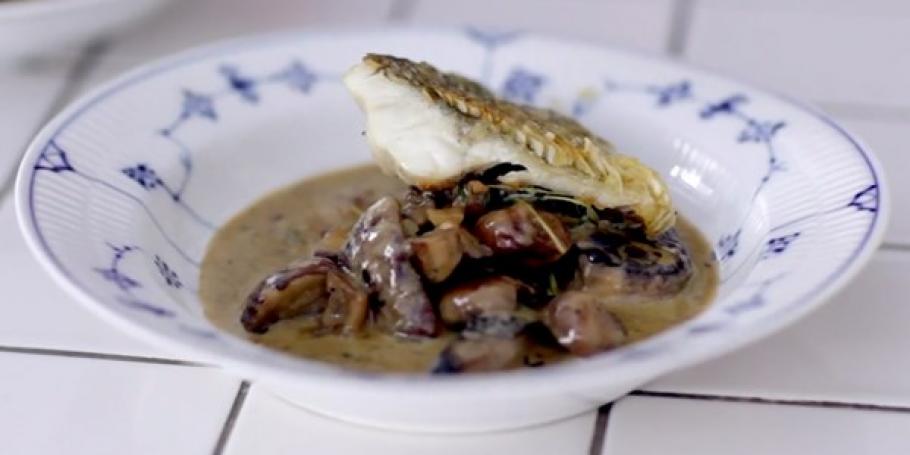 Skindstegt hvidfisk med stuvede svampe