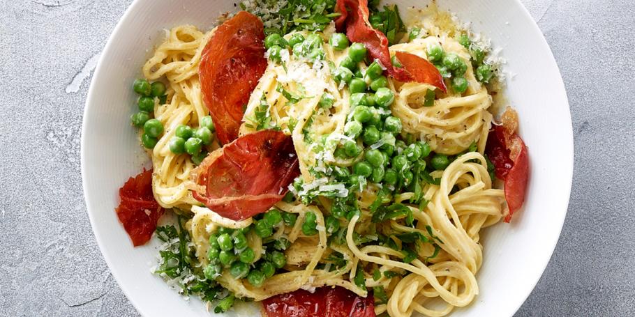 Knæk parmaskinken i mindre stykker og fordel den på pastaen sammen med hakket persille og resten af parmesanosten.