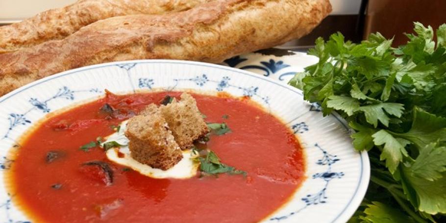 Serveres med et godt brød, sprøde croutoner, creme fraiche og bredbladet persille.